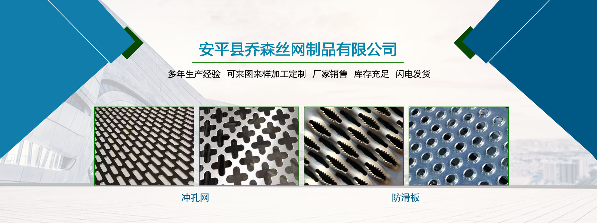 安平縣喬森絲網(wǎng)制品有限公司主營產(chǎn)品:篩網(wǎng)、金屬裝飾網(wǎng)、沖孔網(wǎng)板、防滑板和軋花網(wǎng)。常年現(xiàn)貨供應(yīng)45號黑鋼絲編織篩網(wǎng)、熱鍍鋅鋼絲篩網(wǎng)、304不銹鋼篩網(wǎng)和冷鍍鋅鐵絲網(wǎng),加工定做耐磨65號錳鋼絲篩網(wǎng)、菱形孔防堵篩網(wǎng)、養(yǎng)殖用長方孔鐵絲網(wǎng)、金屬裝飾網(wǎng)、盤條